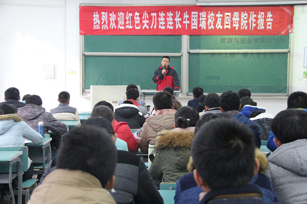 11月28日上午,能源与安全学院邀请学院优秀毕业生、现任陆军第31集团军“红色尖刀连”连长牛国瑞回母院,在北区205教室作励志成才报告。学院党委副书记金德主持报告会。