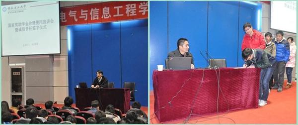 宣讲会结束后,在徐关怀的监督下,国家奖助学金获得者代表在《国家奖助学金合理使用诚信承诺书》上签字。