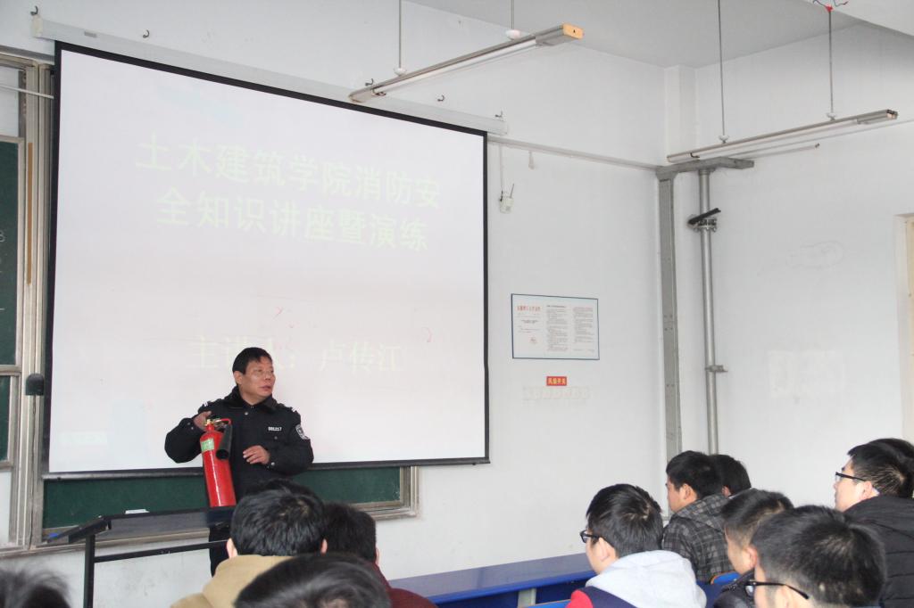 为贯彻落实学校冬季安全月活动文件精神,普及消防安全知识,增强学生消防安全意识,11月28日上午,土木建筑学院邀请校保卫处消防科卢传江老师在校本部新附2205教室作了一场消防安全知识讲座,并指导开展了实地消防演练活动。讲座由学院副院长吴秉江主持,2015级全体研究生参加了活动。