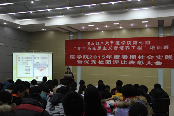 11月28日晚,医学院2015年暑期社会实践暨优秀社团评比表彰大会在西校区图书馆二楼报告厅举行。校团委副书记黄胜龙、学院党委副书记张可佳及全体辅导员担任评委。学院第七期“青马工程”培训班学员近240人观看了比赛。