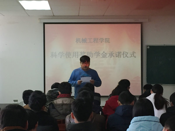 12月4日,机械工程学院在实验中心大楼1107教室举行科学合理使用奖助学金公开承诺仪式。学院党委副书记徐育军,2013级辅导员和学生代表共100余人参加了仪式。