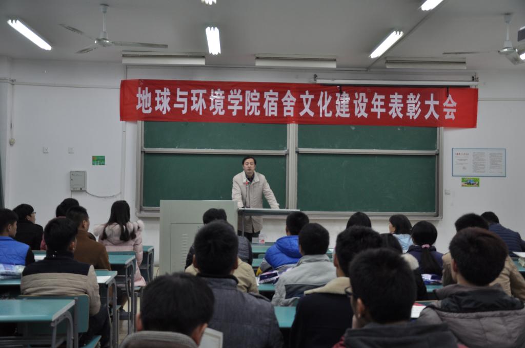 12月11日晚,地球与环境学院在北实204教室召开宿舍文化建设年活动总结表彰大会。学院党委副书记侯辉,各年级辅导员、学生干部及获奖宿舍代表120余人参加表彰大会。学院团委副书记邵飞主持会议。