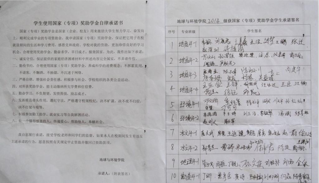 辅导员张贺海组织2014级获奖助学生签订自律承诺书