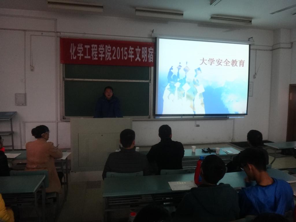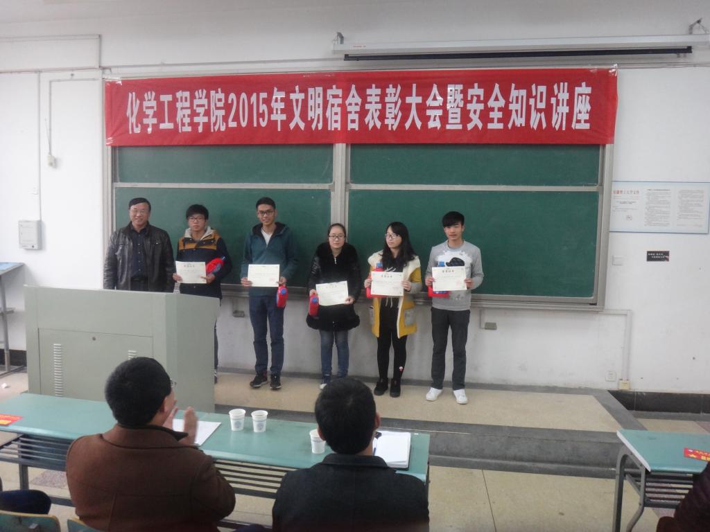 为表彰在寝室文化构建中涌现出的一批优秀寝室,增强大学生安全防范意识,广泛普及安全防护知识,12月11日下午,化学工程学院在北区实验楼401教室举行2015年文明宿舍表彰大会暨安全知识讲座。校保卫处副处长孙东升作了安全知识专题讲座。学院副院长张洪流、党委副书记徐泽绵出席表彰会。