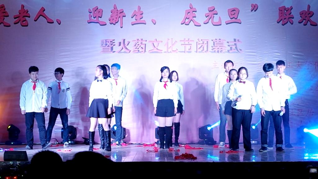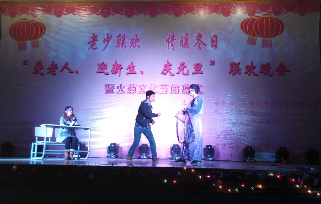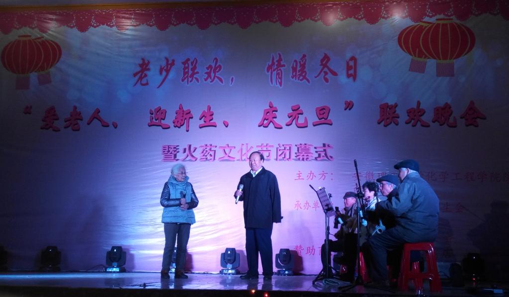 12月12日晚,由化学工程学院团委、学生会、火药文化社,安理大社区居委会联合举办的“爱老人、迎新生、庆元旦”联欢晚会暨火药文化节闭幕式在校北区乒乓球馆隆重举行。化学工程学院党委副书记徐泽绵、团委副书记杨志华,理工大社区居委会主任刘守则等出席了本次活动。