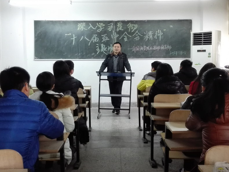 12月14日下午,外国语学院党委书记、院长石秀光在学院七楼教室带领大一学生干部学习党的十八届五中全会精神。党委副书记程秀霞参加了学习。