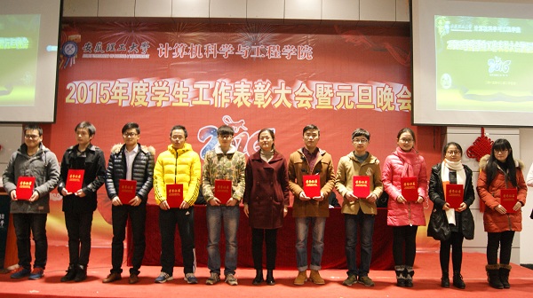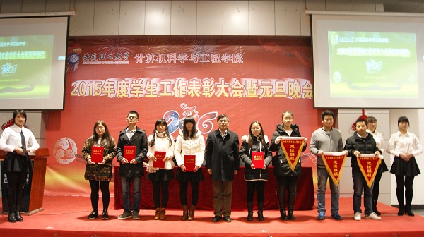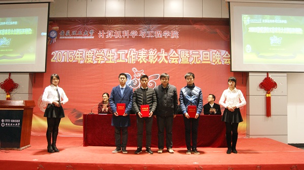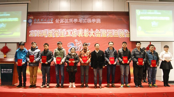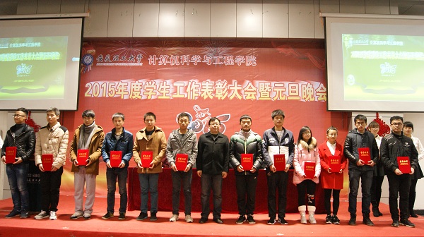 院长陆奎宣读《计算机科学与工程学院关于表彰2015年度学生工作先进集体和先进个人的决定》。学院领导分别为先进班集体、优秀学风寝室、优秀文明寝室、四六级学习之星、学生干部先进个人、创业之星、校园文体之星、学科竞赛奖等先进集体和个人颁奖。