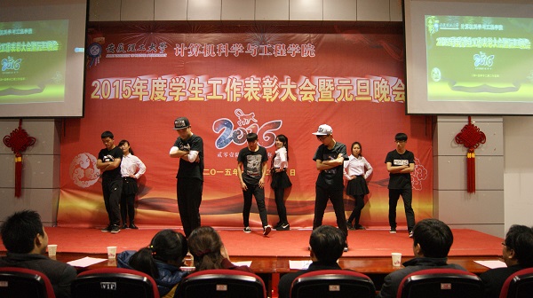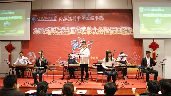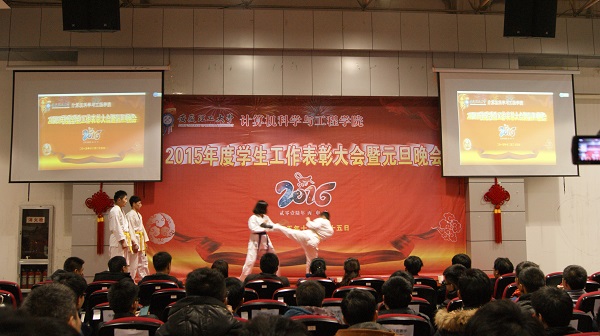 随后,计算机学院2016年新年晚会正式拉开序幕。过去一年在国家及学校的各类文化艺术活动中斩获奖项的方紫荆、刘继斌等计科学子们带来了舞蹈、歌曲、相声、情景剧、武术表演、民乐合奏等节目。整场演出活力十足,异彩纷呈,同学们用精彩的表演传递了美好的祝福,诠释了青春激情,展示了丰富多彩的校园文化,传播了积极向上的青春正能量,赢得了在场观众的阵阵掌声。