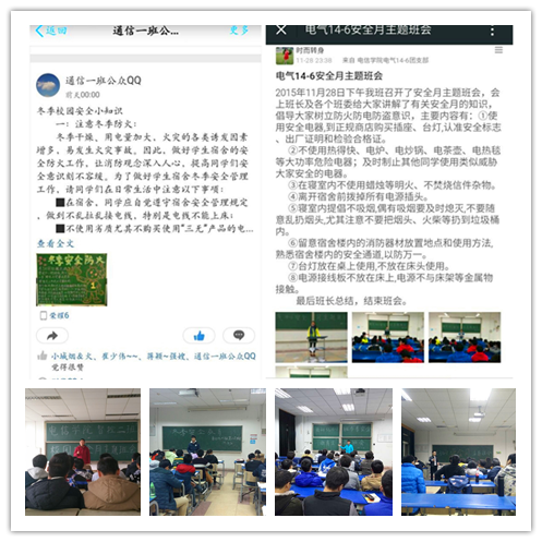各班级团支部还利用微博、微信等新媒体进行网上安全宣传教育,通过班级自查、互查和学院抽查等方式让安全教育工作真正落实、落细、落小,为广大同学营造一个安全稳定的环境来迎接新年的到来。