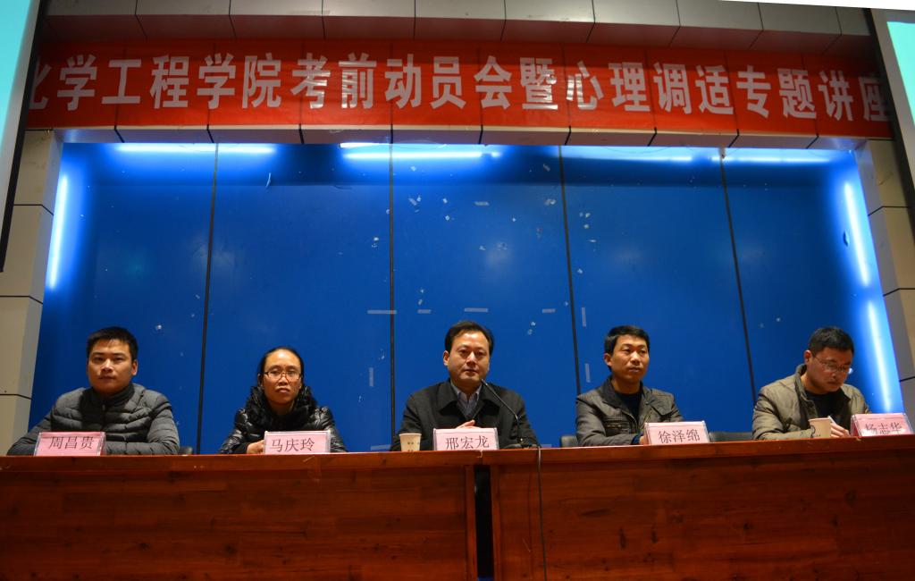 为了保证同学们以积极的姿态迎接考试,增强诚信意识,12月30日晚,化学工程学院在北图二楼报告厅成功举办考前动员会暨心理调适专题讲座。学院副院长邢宏龙、院党委副书记徐泽绵、2015级辅导员杨志华及全体大一新生参加了会议。会议由15级辅导员周昌贵主持。