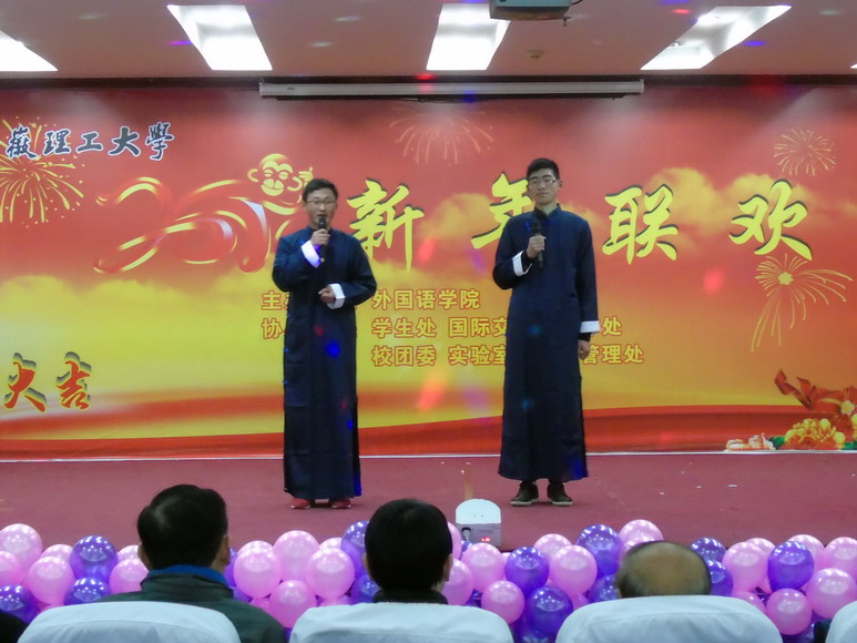 1月9日下午,外国语学院新年师生联欢会在校本部九楼报告厅拉开帷幕。副校长叶醒狮出席联欢会。校相关职能部门领导、学院“在职党员进社区”活动联系服务单位南岭社区王春秀主任与学院师生们一同观看了文艺汇演。