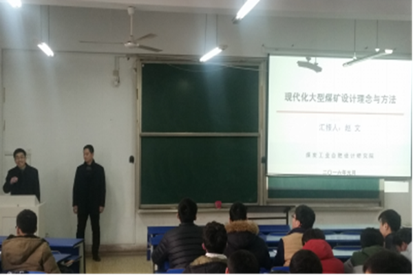赵文2002年毕业于安徽理工大学采矿工程专业,先后主持了淮南矿业集团顾桥煤矿、内蒙麻地梁煤矿、内蒙色连二矿、内蒙唐家会煤矿等特大型矿井设计。报告会上,赵文从现阶段我国煤炭产业政策入手,介绍了目前我国煤矿建设的方针、现代化大型煤矿的概念及内涵,煤矿设计的程序及步骤,设计人员应有的职业素养和职业操守等。他结合西北地区多个现代化大型矿井的设计实例,着重阐述了设计理念、开拓方式及采煤方法的选择、新型辅助运输方式及发展方向等。赵文还与师生进行了技术交流。