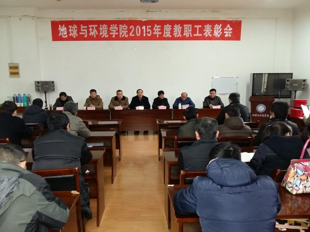 1月22日上午,地球与环境学院在学院201会议室隆重召开2015年度教职工表彰大会。大会由学院副院长刘启蒙主持。校科技产业处处长华心祝、校工会主席李广田、教务处副处长刘群红和校保卫处副处长刘训强等校职能部门领导应邀出席并为获奖者颁奖。学院全体教师70余人参加了表彰大会。