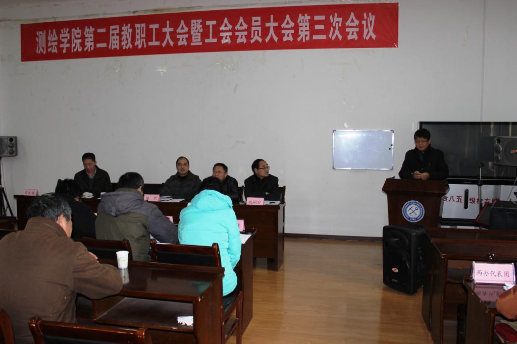 李广田代表校工会对测绘学院二届三次教职工大会暨工会会员大会的召开表示热烈祝贺,对为测绘学院的建设和发展做出贡献的教职工和工会会员表示诚挚问候。应学院教职工和工会会员的要求,他还通报了新校区教工住宅建设的有关情况,并现场解答教职工的提问。