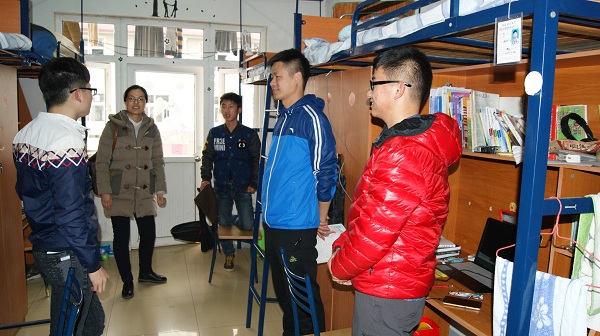 2月28日下午,蒋群带领各年级辅导员走访学生宿舍,了解学生返校情况。在走访学生宿舍过程中,学院老师与学生分享了愉快的假期生活,认真听取同学们反映的问题,要求各宿舍做好寝室卫生和安全防范等工作。