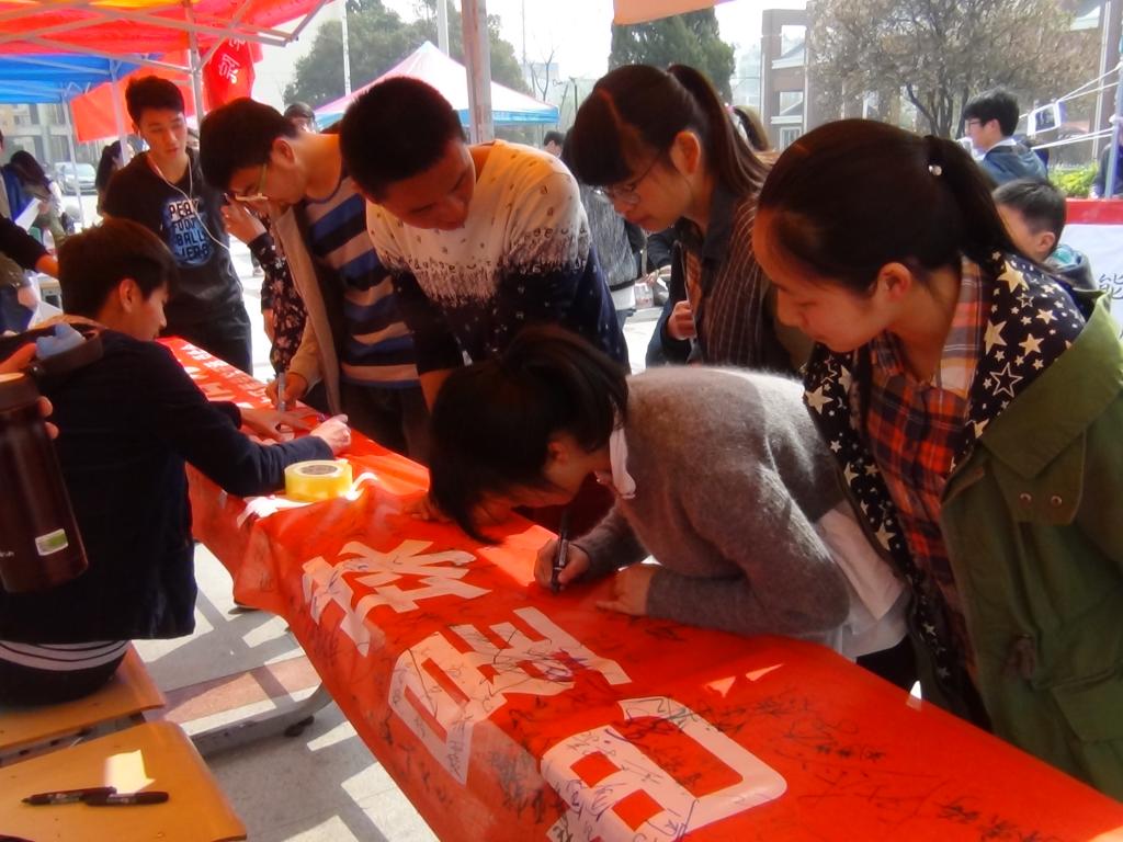 上午,志愿者们在北区喷泉广场发起“地球一小时”倡议活动。同学们纷纷在“为了蓝色星球,转变生活方式”条幅上签下姓名。通过签名、发放环保宣传资料等方式,呼吁同学们一起行动起来,为了公众共同期待的蓝色天空,从衣食住行乐的日常生活小事入手,践行可持续的生活和消费方式。