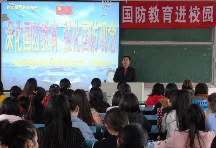 刘传安围绕“深化国防教育,强化国防观念”的主题,结合当前国际军事战略态势、周边安全形势、朝鲜半岛局势和钓鱼岛、南海的海洋权益纠纷的热点等问题作了专题宣讲,通过详实资料、生动的案例和鲜活短片,阐述了国防教育在现实中的重要意义,使广大师生深刻认识到“国无防不立,民无防不安”的道理,更加珍惜当前的稳定形势。同时,引导广大学子情系国防、心系国家,进一步激发了同学们保家卫国的责任感。