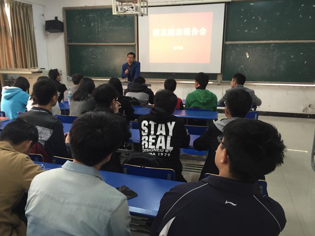 为帮助在校大学生树立正确的职业规划目标,以更加积极的心态和百倍的信心迎接未来社会环境的大挑战,应理学院邀请,苏州林轩建材有限公司总经理、校友陆吴峰为在校大学生作励志报告。理学院2014级近100名学生听取了报告会。