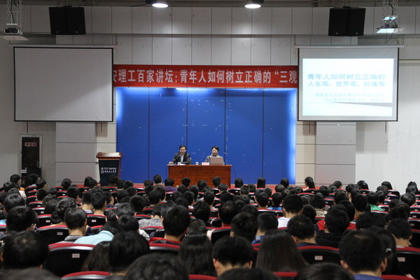 朱继东结合现在社会热点、热词和生动案例,分析了在社会发展的全球化、市场化、网络化过程中,西方价值观念的渗透和对人们“三观”的冲击和挑战,并指出当前在培育和践行社会主义核心价值观中,树立正确的“三观”更显重要。朱继东辩证分析了当前的社会现象,重点分析了党的十八大后,党中央加强党的执政能力建设和社会治理所取得的成效,引导青年学子正确认识党史、国史,勇于批判西方错误思潮,主动践行社会主义核心价值观,学习贯彻习近平总书记系列重要讲话精神,从而将自己的人生目标融入国家、社会需要,树立正确的人生观、世界观、价值观。