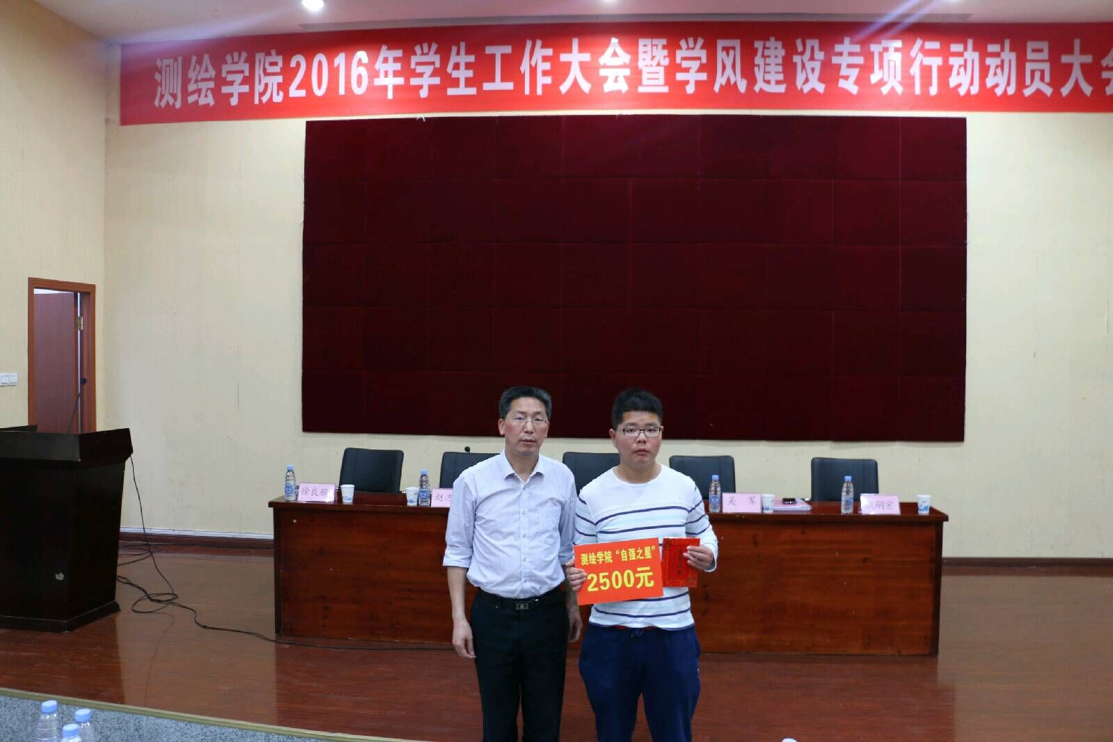 院行政副院长姚嗣宏宣读了测绘学院“大学生自强之星”表彰决定。赵志根为“大学生自强之星”获得者陈正超同学颁发了证书及奖金。