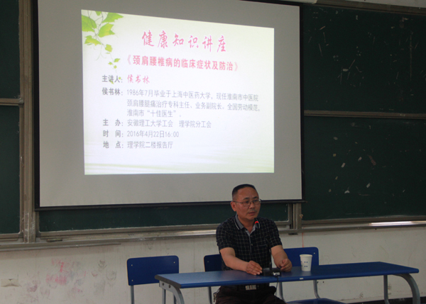 4月22日下午,全国劳动模范、安徽省“五一劳动奖章”获得者,淮南市中医院业务副院长侯书林应校工会和理学院的邀请,来校作了题为《颈肩腰椎病的临床症状及防治》的健康知识讲座。讲座由理学院院长经来旺教授主持。学校五十余位教职工聆听了讲座。
