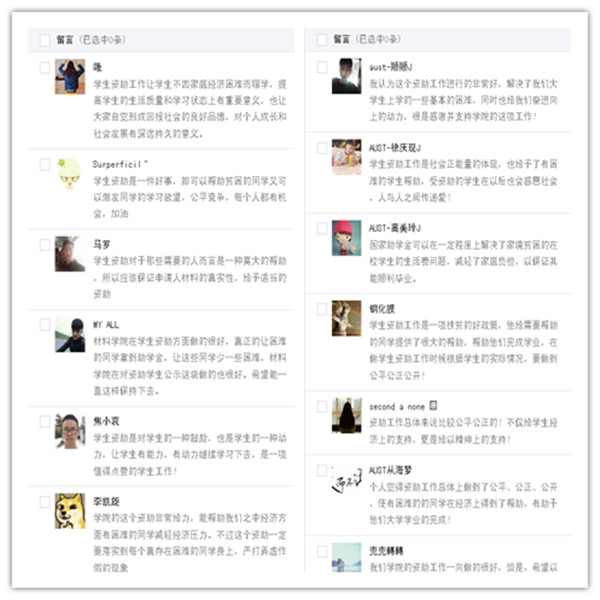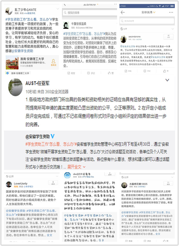 微博、微信话题互动。材料学院充分利用新媒体平台推送资助工作大讨论活动相关话题,广大师生积极参与线上互动和讨论,充分体现了新时期学生资助工作的全新维度和成效。学院师生通过关注“安徽学生资助”新浪微博,广泛参与学生资助工作“怎么看、怎么办”大讨论微话题互动活动。同时,学院微信公众号在活动期间推出 “学生资助工作,你怎么看?”、“材料学院学生资助工作面面观”等专题栏目,充分占据资助工作的网络阵地。在扩大影响力的同时,广泛征求线上意见和建议,详细介绍国家资助政策,宣传学院奖助体系,获得了良好反响。