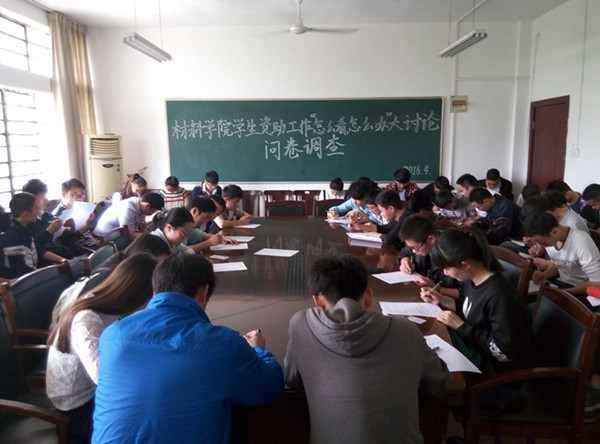 资助工作问卷调查。大讨论活动期间,学院从资助工作“三个精准”的标准出发,制作《材料科学与工程学院学生资助工作调查问卷》。从本学年受资助学生、学生干部和未受资助学生中随机抽取共340余人参加本次问卷调查。调查问卷从奖助学金评定公正性、奖助学金发放情况、奖助学金合理使用、学院资助工作满意度等几个方面全面向同学征求意见和建议。学院将对收集到的数据进行分析,为后续工作提供参考。