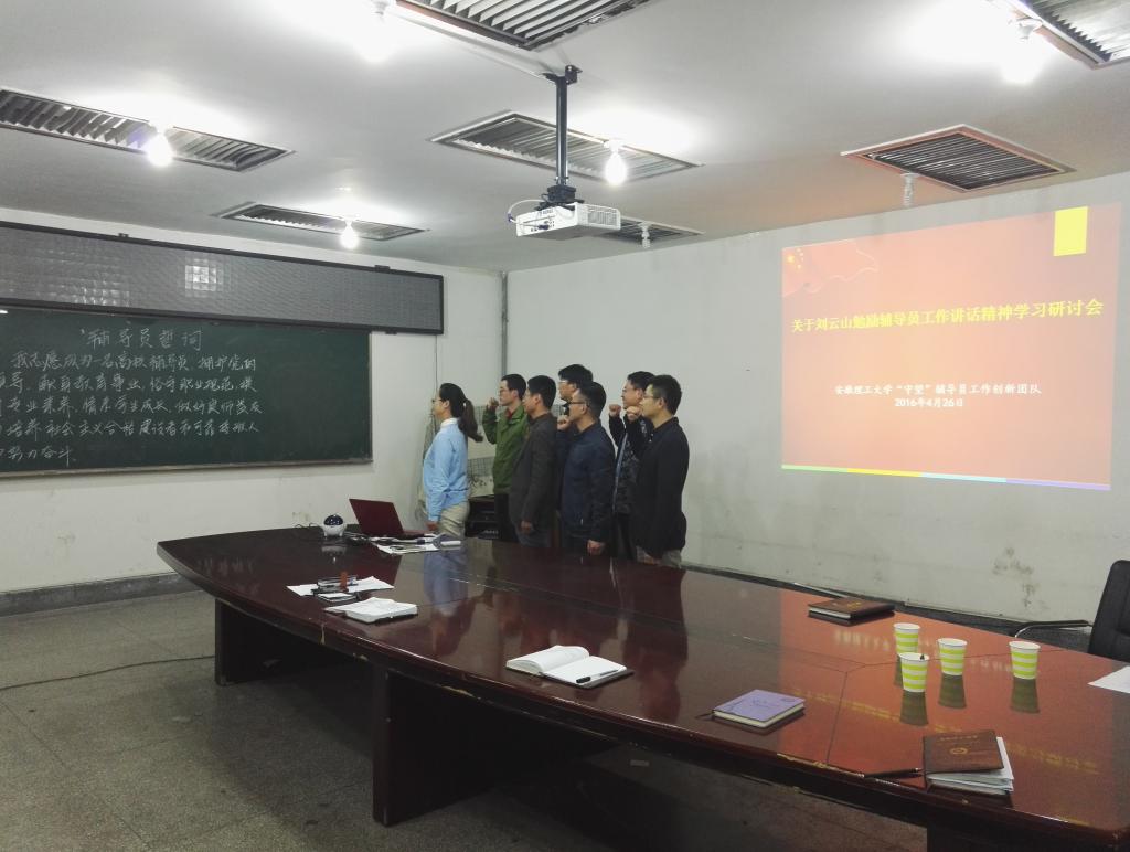 4月23日,中共中央政治局常委、中央书记处书记刘云山到西安交通大学进行工作调研时,走进辅导员、学生宿舍时表示,辅导员工作很光荣,要建设好这支力量。刘云山对辅导员的殷切勉励,让广大辅导员深受鼓舞、倍感振奋。大家围绕刘云山同志讲话,纷纷表达了自己对辅导员工作的认识与感悟,认为辅导员工作使命崇高、责任重大。辅导员要坚持正确政治方向,忠实履行岗位职责,恪守职业道德,遵守职业标准;要情系学生,走亲情,付真心,用自己的爱心为学生的人生护航;要深入学生实际,深入学生心灵,把握学生的时代特征和精神世界,增强工作的针对性与实效性;要加强研究,把经验和汗水总结凝练成理论与成果,增强工作的科学性;要坚守辅导员岗位,久久为功,在坚守和坚持中“守望成长、静待花开”,在护航学生成长中成就自己人生的辉煌。