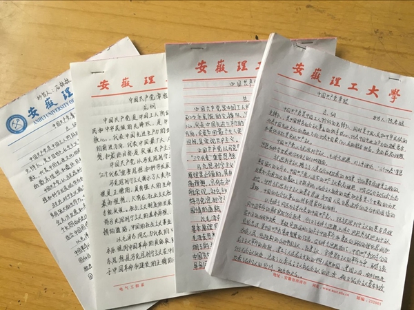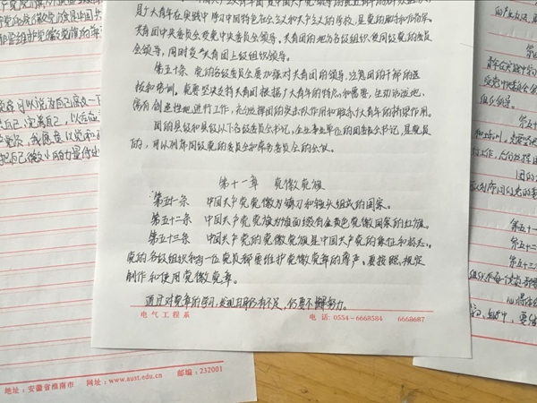 “逐条逐句地抄写,不是为了应付,更不是做表面文章,而是促使自己静下心来,用心去学习党章”,面对着厚厚一沓自己手抄的党章,研究生14级党员陈孝根深有体会地说道。