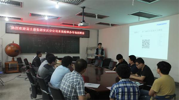 5月20日,电气与信息工程学院邀请富士康科技集团安庆分公司在学院三楼会议室举办专场招聘会,来自电信学院和机械学院相关专业的10余名毕业生参加了此次招聘。