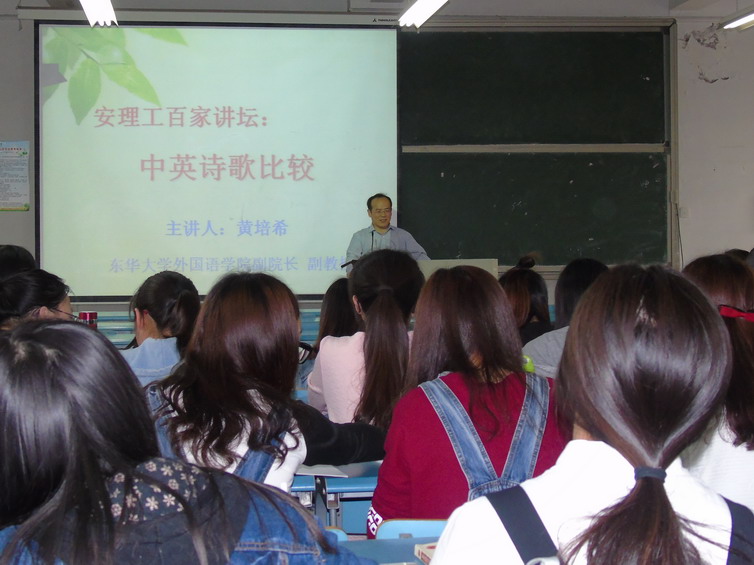 5月24日下午,东华大学外国语学院副院长黄培希副教授应邀在医教301教室为外国语学院师生作中英诗歌文化专题报告会。报告会由院党委书记、院长石秀光主持。