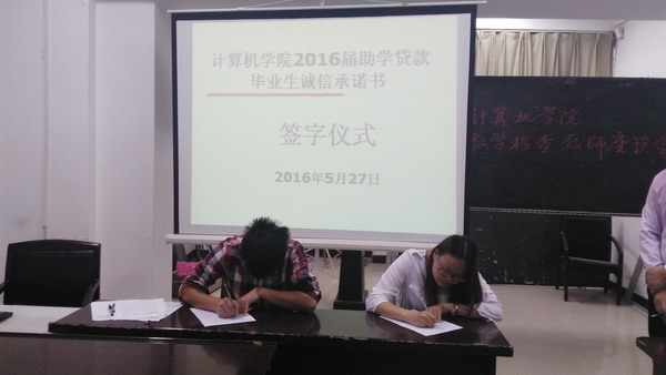 为做好贷款毕业生还款确认工作,增强学生感恩意识和诚信还款意识,教育和引导大学生以实际行动做到文明离校,5月27日上午,计算机学院在院427会议室举办2016届贷款毕业生诚信承诺书签字仪式。仪式由毕业班辅导员胡彪主持。