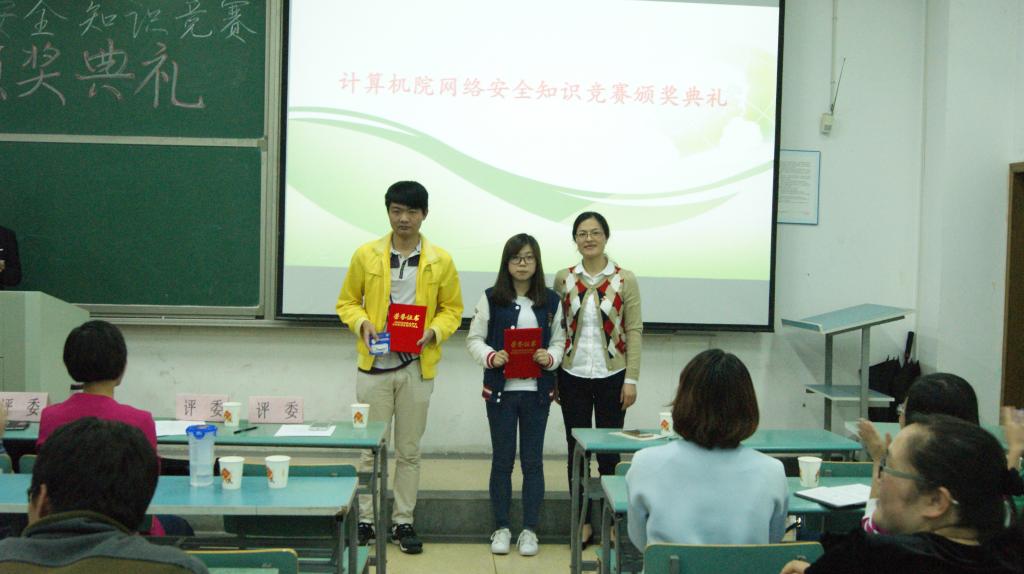 网络安全知识竞赛。5月22日,首届网络安全知识竞赛在北区实验楼举行,学院2014级、2015级近百名学生通过笔试答题的形式参加了竞赛。本次安全知识考察内容包括:数据安全、传输安全、服务器安全、防火墙安全等内容,涉及面广,内容丰富,旨在宣传普及网络安全知识,提高大学生的网络安全防范意识。最终,夏晨、贺方方2位同学获得一等奖,丁晓辉等3位同学获得二等奖,李涵等5位同学获得三等奖。