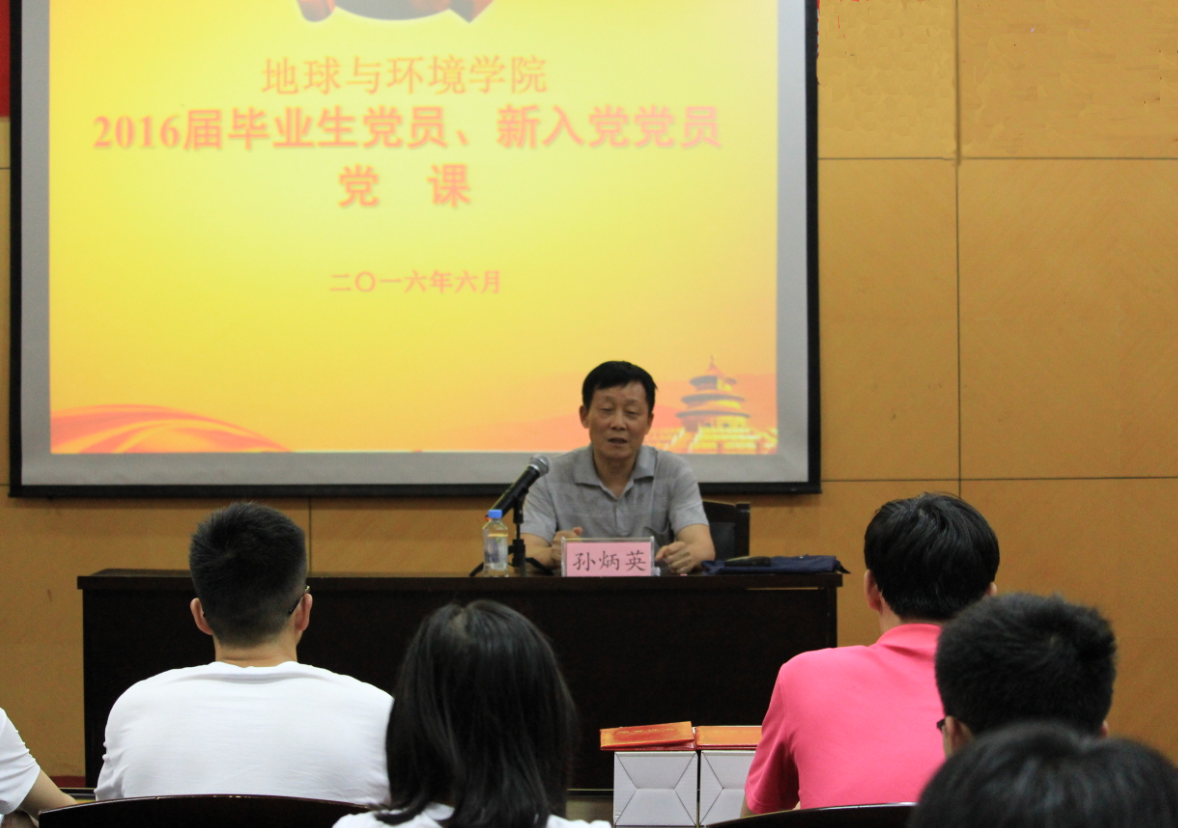 6月16日,地球与环境学院邀请校特邀党建组织员、校组织部原部长孙炳英老师在校图西会议室为学生党员上“党员的义务和权利”专题党课。院党委书记盛鹏飞主持讲座,院党委副书记侯辉,各年级辅导员,2016届毕业生党员和新入党学生党员参加。
