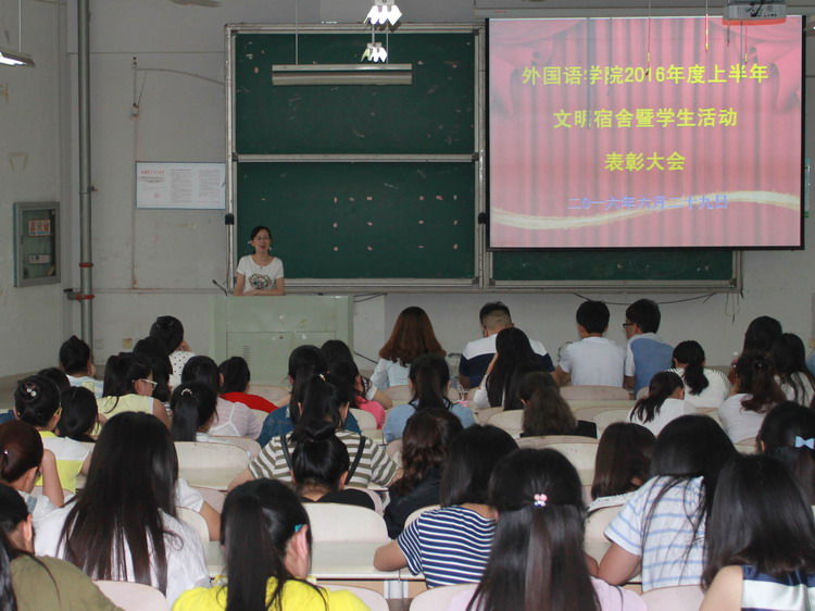 7月1日下午,外国语学院在医教楼303举行2016年上半年文明寝室表彰大会。院党委副书记程秀霞、团委书记张学森、辅导员肖婷和大一大二全体学生共300人参加了大会。