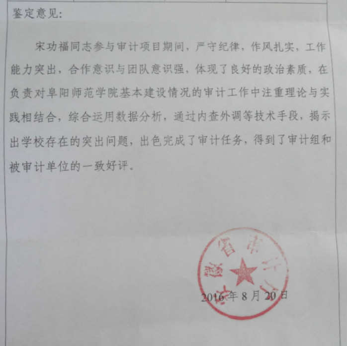宋功福同志经学校同意,于2016年7月10日至8月18日期间,参与审计厅审计项目,负责基本建设工程管理情况的审计工作。省审计厅认为,宋功福同志能够按照审计要求,严守纪律,作风扎实,工作能力突出,合作意识与团队意识强,体现了良好的政治素质,在负责基本建设情况的审计工作中注重理论与实践相结合,综合运用数据分析,通过内查外调等技术手段,揭示出存在的突出问题,出色完成了审计任务,得到了审计组和被审计单位的一致好评。