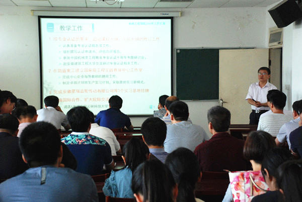 院长王传礼采用PPT形式总结了2016年上半年工作,并布置了2016年下半年工作。他对学院在教学、科研、党建、师资、学生管理等工作取得的成绩表示肯定,对全院教职工的辛勤付出表示感谢,同时分析了学院存在的问题。他强调,下半年除完成学院2016年党政工作要点外,还要完成机械设计制造及其自动化的再认证和测控技术与仪器专业认证的准备工作,学院教职工要以创新的精神、务实的态度,真抓实干,攻坚克难。