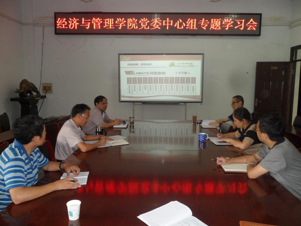 9月5日上午,经济与管理学院党委召开中心组学习会,专题学习《中国共产党问责条例》。院党委书记李梁主持会议,中心组全体成员参加学习并进行了交流讨论。