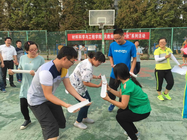 为庆祝第三十二个教师节,迎接中国传统节日“中秋节”,活跃教职工业余文化生活,材料学院工会于9月14日下午举办了传递乒乓球、踢毽子、多人跳绳及篮球运球接力赛等趣味活动。学院六个工会小组60余名教职工分别组队参赛。