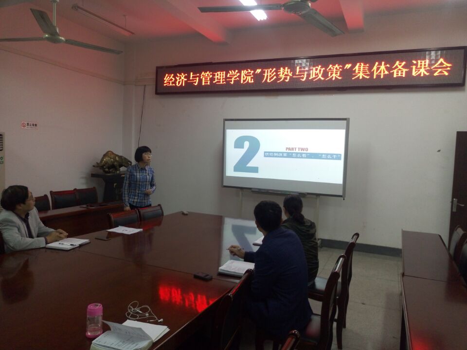 本学期“形势与政策”课授课老师李洁就专题《以供给侧改革引领新常态》作了示范教学。与会授课老师对讲稿内容、课件制作和教学重难点进行了热烈讨论和交流。