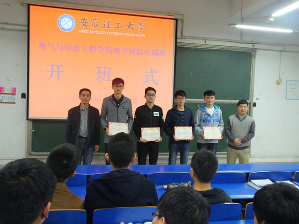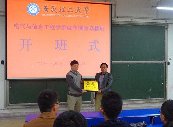 10月28日晚,电气与信息工程学院在北区2201教室举行“咸亨国际卓越班”开班仪式。浙江咸亨国际通用设备有限公司副总经理张再锋,电信学院副院长欧阳名三,卓越班企业班主任韩先莹,学院党委副书记徐关怀,2014、2015级学生辅导员以及120名同学出席开班仪式。开班仪式由徐关怀主持。
