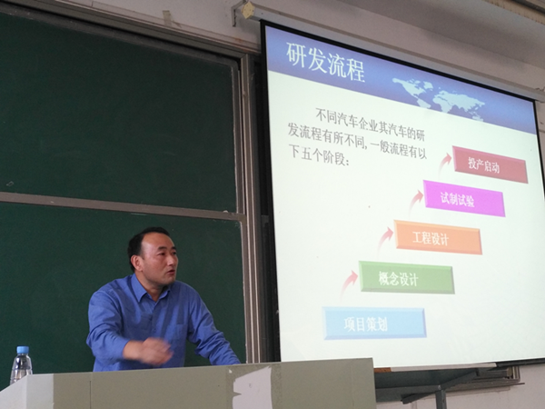 11月5日下午,应科技产业处和机械工程学院的邀请,安徽猎豹汽车股份公司常务副总经理谢有浩教授级高工在北区实验楼404教室,作了题为《现代汽车设计流程与方法》的学术报告。机械工程学院副院长王开松主持报告会,部分教师、研究生、车辆专业大二、大三的本科生近200人参加。