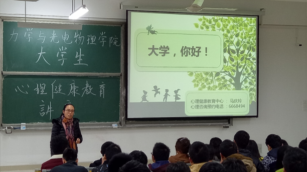 11月9日下午,在新校区天工北206教室,力学与光电物理学院邀请学校心理健康教育中心主任马庆玲老师为2016级新生作了题为《大学,你好!》心理健康教育讲座。140多名新生聆听了讲座。