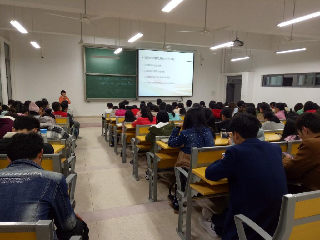11月10日上午,人文学院在明理南楼202教室举行了宗教知识主题宣传讲座。讲座由学院团委副书记陈会主讲,2016级全体新生参加。讲座详细分析了《宪法》、《教育法》、《高等教育法》、《普通高等学校学生管理规定》等法律法规中关于宗教的相关规定,重点阐述了“教育与宗教相分离”要做到五个分离、大学校园宗教活动的“四严禁”、“两不得”等内容,提高了学院学生对于国家宗教政策的理解,增强了识别、抵御和有效防范邪教的能力。同时,在形势政策课教学中,学院加强了有关宗教政策方面的宣传教育。