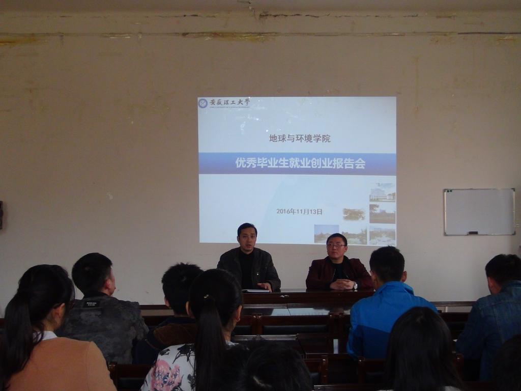 11月13日下午,地球与环境学院邀请地质工程专业2009届优秀毕业生郝志超在学院201会议室举办就业创业报告会。学院党委副书记侯辉主持报告会。2013级地质工程专业学生80余人聆听了报告。