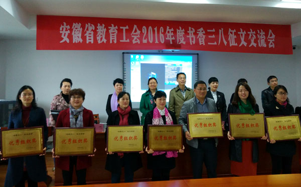 11月14日至16日,安徽省教育工会2016年度“书香三八”征文交流会在金寨县委党校召开。大会总结了我省教育工会系统“书香三八”活动开展情况,并公布了获奖者名单,进行了获奖论文交流。我校共向省教育工会推荐征文28篇,其中5篇获得一等奖、9篇获得二等奖、14篇获得三等奖,学校被授予“优秀组织奖”。