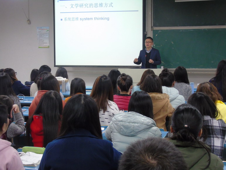 戚涛教授以日常生活中直觉和线性思维实例引入讲座主题,指出了培养和训练系统思维(System Thinking)和非线性思维(Nonlinear Thinking) 对文学学习和研究的重要性。他以同学们比较喜欢的影视明星和电影电视剧为例,介绍了文学的发生模型以及文学与意识形态、文学与身份、文学与人格、文学与现实等相互关系。戚涛教授语言生动风趣,浅显易懂,讲座在轻松愉快的气氛中圆满结束,