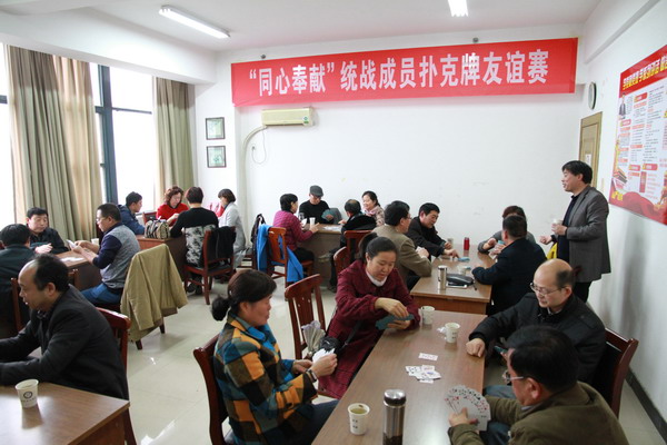 11月20日下午,校党委统战部在民主党派活动室举办了“同心奉献”统战成员扑克牌友谊赛。来自7个党派基层组织和校党外知识分子联谊会的统战成员34人参加了比赛。