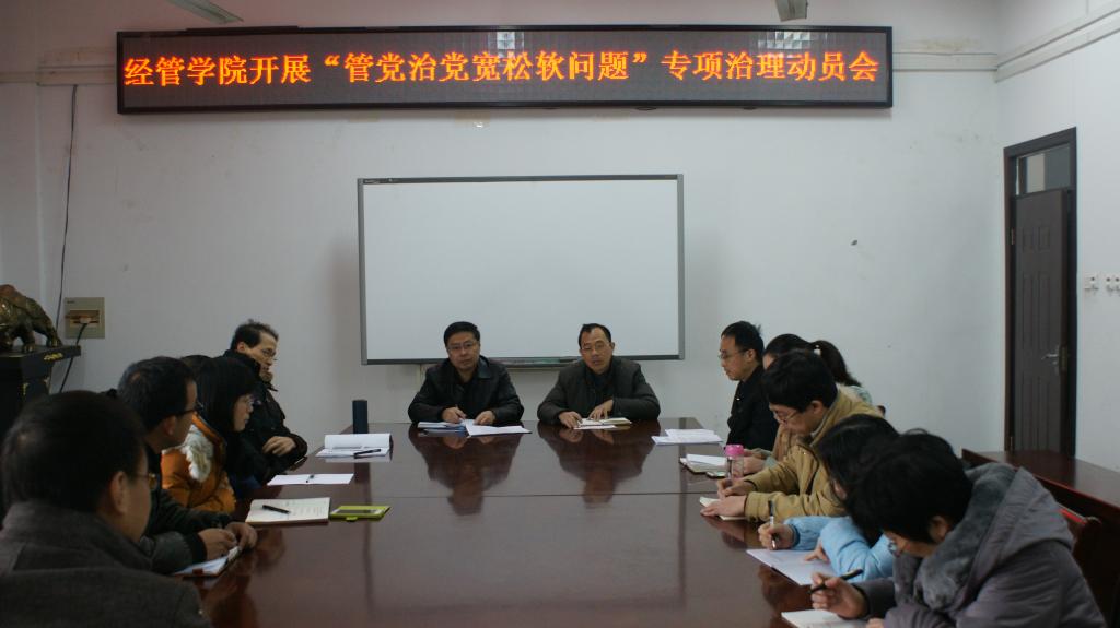 11月25日上午,经济与管理学院党委在学院三楼会议室召开“管党治党宽松软问题”专项治理工作部署会。学院党委书记李梁作动员讲话,院长何刚主持会议,学院各党支部书记和系主任参加了会议。