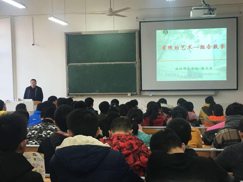 11月26日上午,洛阳师范学院张之正教授受邀在新校区天工南106教室作了题为《有限集合的艺术——组合数学》的学术报告。数学与大数据学院副院长方贤文(主持工作)主持报告会。数学与应用数学、信息与计算科学2016级本科新生聆听了报告会。